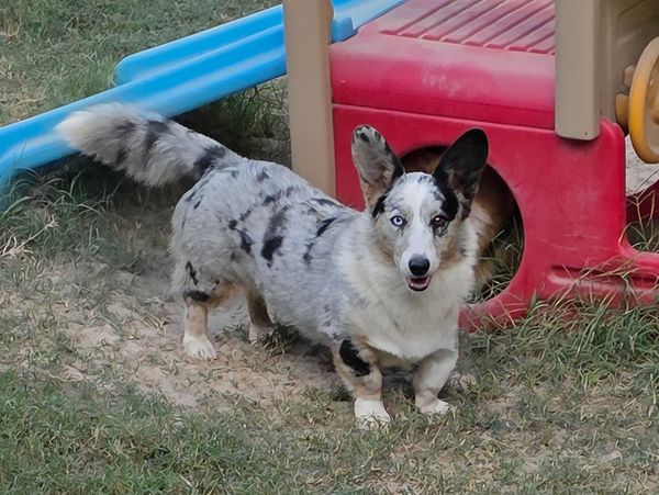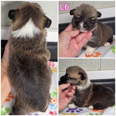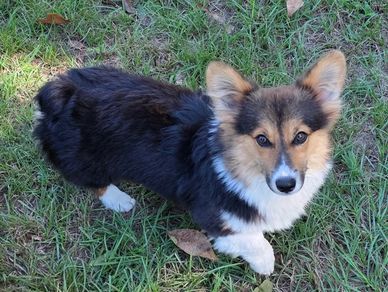 His Mom, Nellie, is a very sweet Akc PWC Fluffy Tri. Nellie came to ArmnalegRanch from Missouri. She weighs 28 lbs.